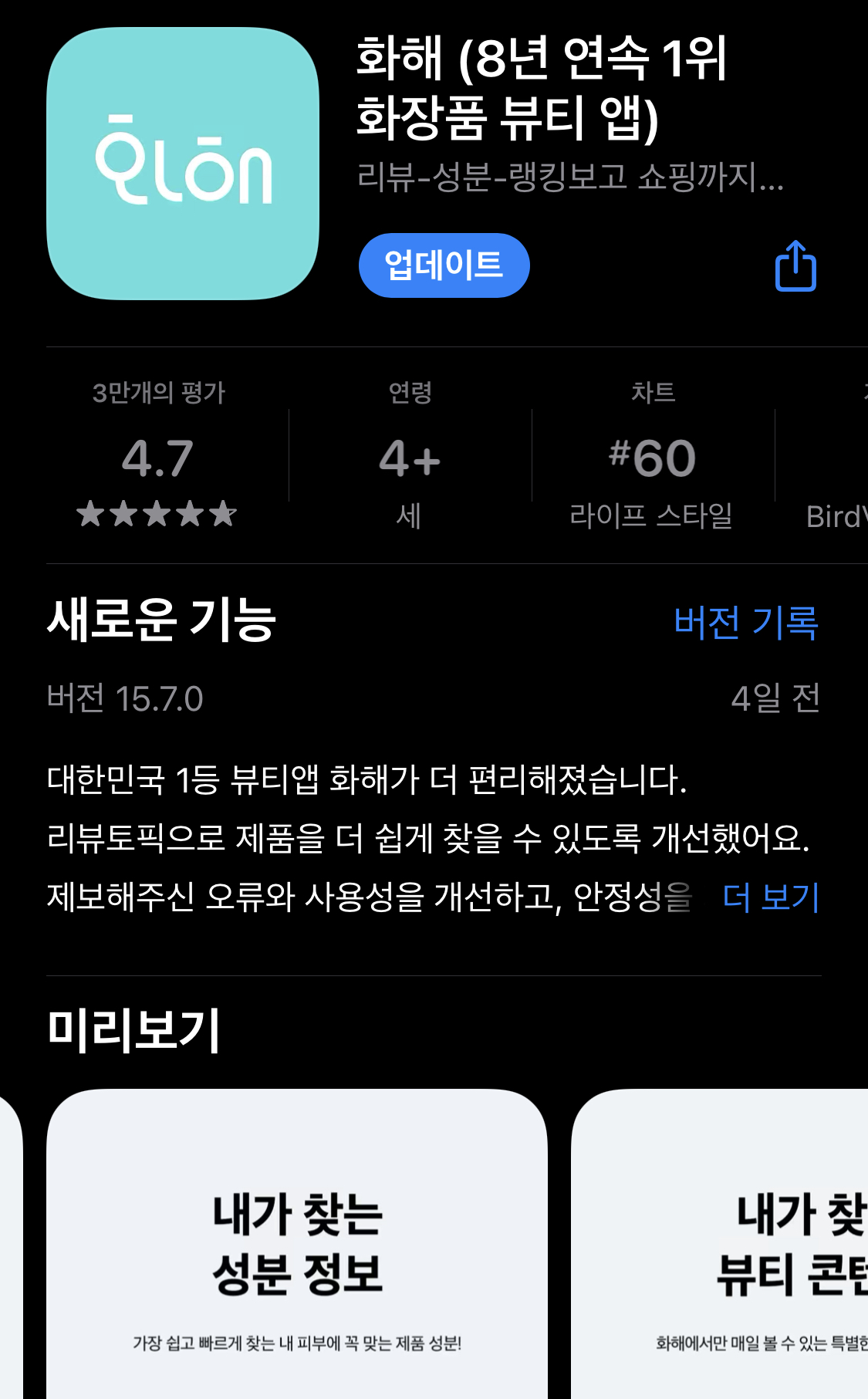 그래서 서칭하다가 ‘화해’라는 앱에서 유해성분을 한 번에 체크할 수 있다는 사실을 알게되었어요. 실제 피부가 민감한 분들이나 임산부들이 많이 사용하는 화장품 어플이라고 하더라구요.