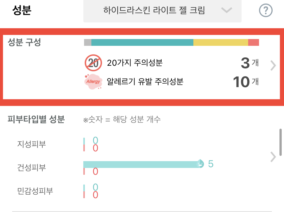 특히, 임산부가 피해야할 페녹시 에탄올을 포함하고 있었고 이 외 향료, 소듐벤조에이트 등 주의성분이었습니다. 임산부로 한정된 건 아니지만 주의가 필요하다고 판단되는 성분들을 색깔과 등급별로 파악할 수 있어서 좋았어요.